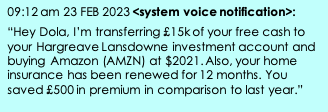 - Through customised Banking innovations: Part of my remit in my day to day working life is initiating and observing customer testing. Whenever I’ve put early prototypes of financial advise products in front of our customers, some of the feedback I often receive is that it can feel really generic and impersonal. It also tends to be overly reliant on subjective advice rather than personal to the customer because the product and customer information needed to improve it can be hard to pull together, both within the bank (silo’s) and across different institutions. Self-driving finance is a reimagined experience where customers can interact with an AI-based voice assistant for advice. The self-driving finance assistant is built to offer guidance on complex decisions like retirement planning, but at the same time, can automate routine transactions such as bill payment and purchases. The bank can identify how much savings a customer can make and essentially automate day to day financial decisions based on predicted cash flow for the individual and move the money to accounts or to make purchases on behalf of the customer. This is starting to take shape already and what you’ll see is sections within mobile apps title ‘insight’ or ‘insight hubs’. Essentially delivering personalised AI-driven insights and suggestions to users. Santander has a version of this called ‘My Money Manager’ integrated into their UK mobile banking app. Within that section you’ll get financial tips, nudges and personalised insights into your spending and any upcoming financial commitments which are sent via push notifications and what they call an ‘insight inbox.’ HSBC have also started on this journey, with the firsts iteration being that they allow customers to see their ‘balance after bills’ based on upcoming future payments such as direct debits and standing orders. However, both these examples are text based and only scratch the surface. The power behind this is the customisation and the ability for system voice notifications rather than text based push notifications to notify customers of more complex automations that have been made on their behalf. To bring it to life, pretend I am the AI voice assistant or an Alexa! As a customer I would have given my consent and should be able to say “whenever I have spare money laying around, other than what I need for day-to-day expenses, reinvest it into whatever earns the highest return.” What I may then get would be the following type of notification from the AI voice assistant: