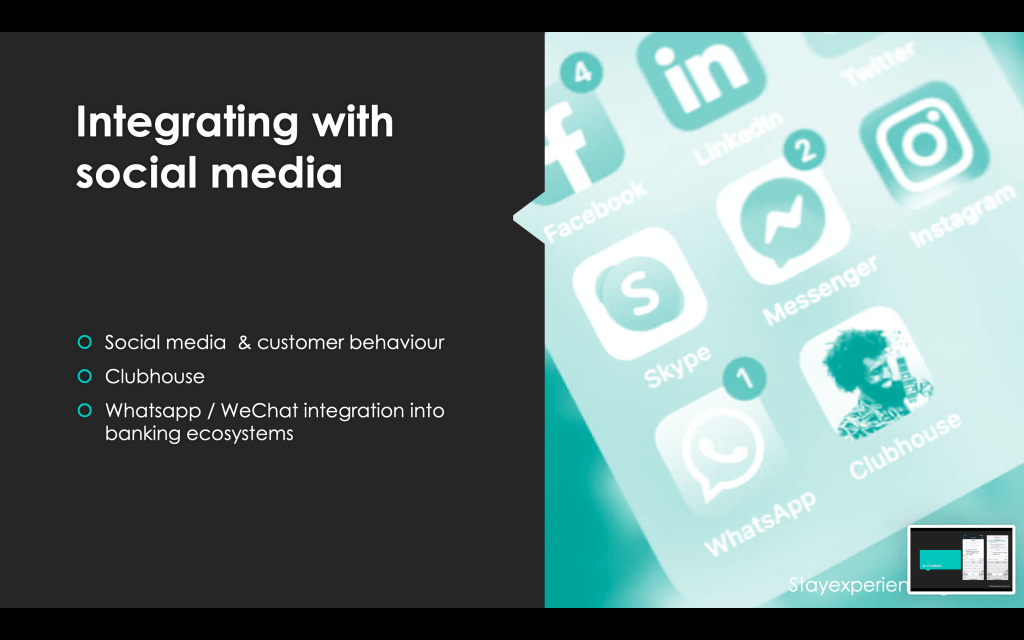 - Through integration with Social Media: Whatsapp is a great example of the correlation between social media and how it can reset customer behaviours and expectations. Clubhouse is another one to watch. So for those of you not yet on Clubhouse and don’t know what it is let me quickly tell you. Clubhouse is a social networking apps based on audio-chat. It allows you to listen in to conversations, interviews and discussions between influencers in different industries on various topics – it’s like a live podcast and with an added layer of exclusivity because it’s invite only – Real virtual world elitism! Now much like Whatsapp and WeChat changed the game on how customers expect to be serviced. .. I believe social media apps like clubhouse will set the same precedent. For example, we know financial services ecosystems are emerging in Asia. WeChat is similar to Whatsapp and some financial companies are able to layer their banking apps on top of existing tech platforms like Wechat. WeChat then connects customer data with the bank allowing customers to transact within the app itself. If voice based apps like clubhouse continue to gain momentum and popularity in moving users away from text based interactions to voice based interactions, then expect banks to follow suit at a later date!